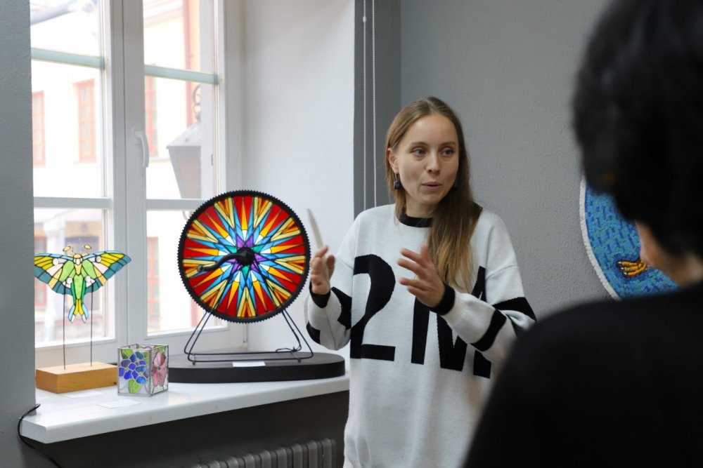 Падчас дэма-класа Паліна Корзун-Фомчанка падрабязна расказала пра працэс вырабу вітража Ціфані, прадэманстравала ўсе неабходныя для гэтага інструменты і матэрыялы.